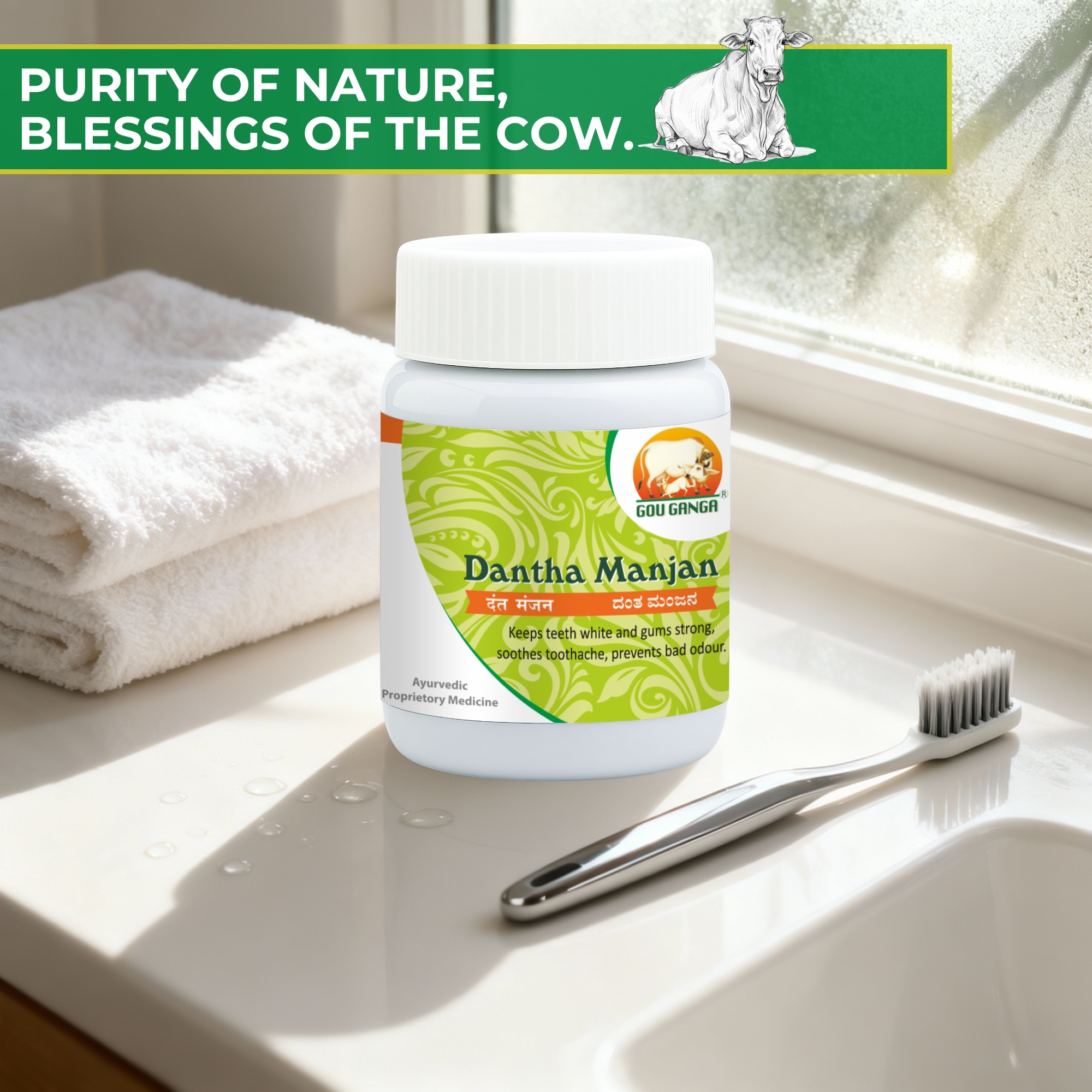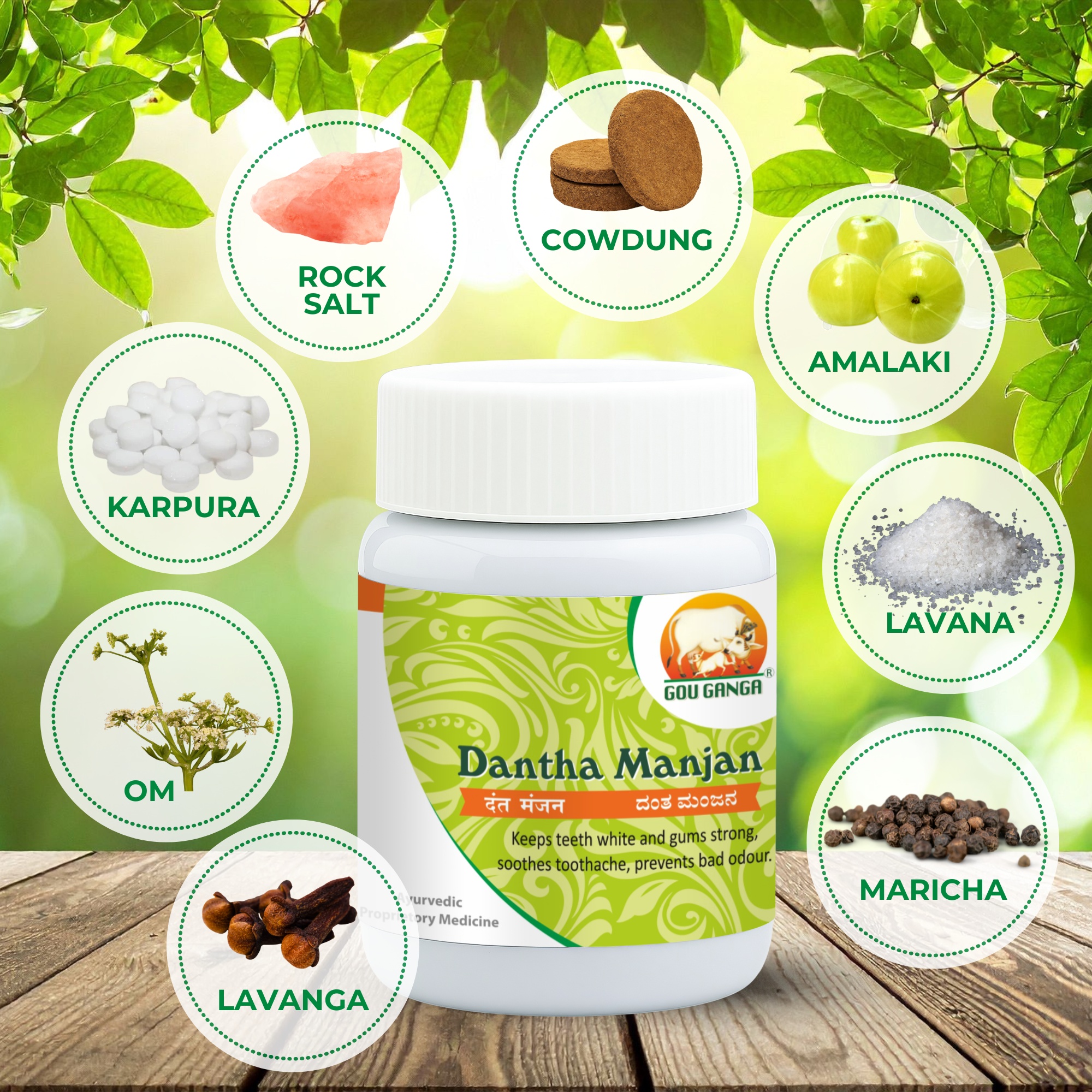 Dantha Manjan is an Ayurvedic tooth powder. The main ingredient of Dantha Manjan is Desi Cow Dung Carbon, Which naturally removes odour. Dantha Manjan is combination of Desi cow dung carbon, Saindav lavan, Lavang, Black pepper and Pacha karpoor.
